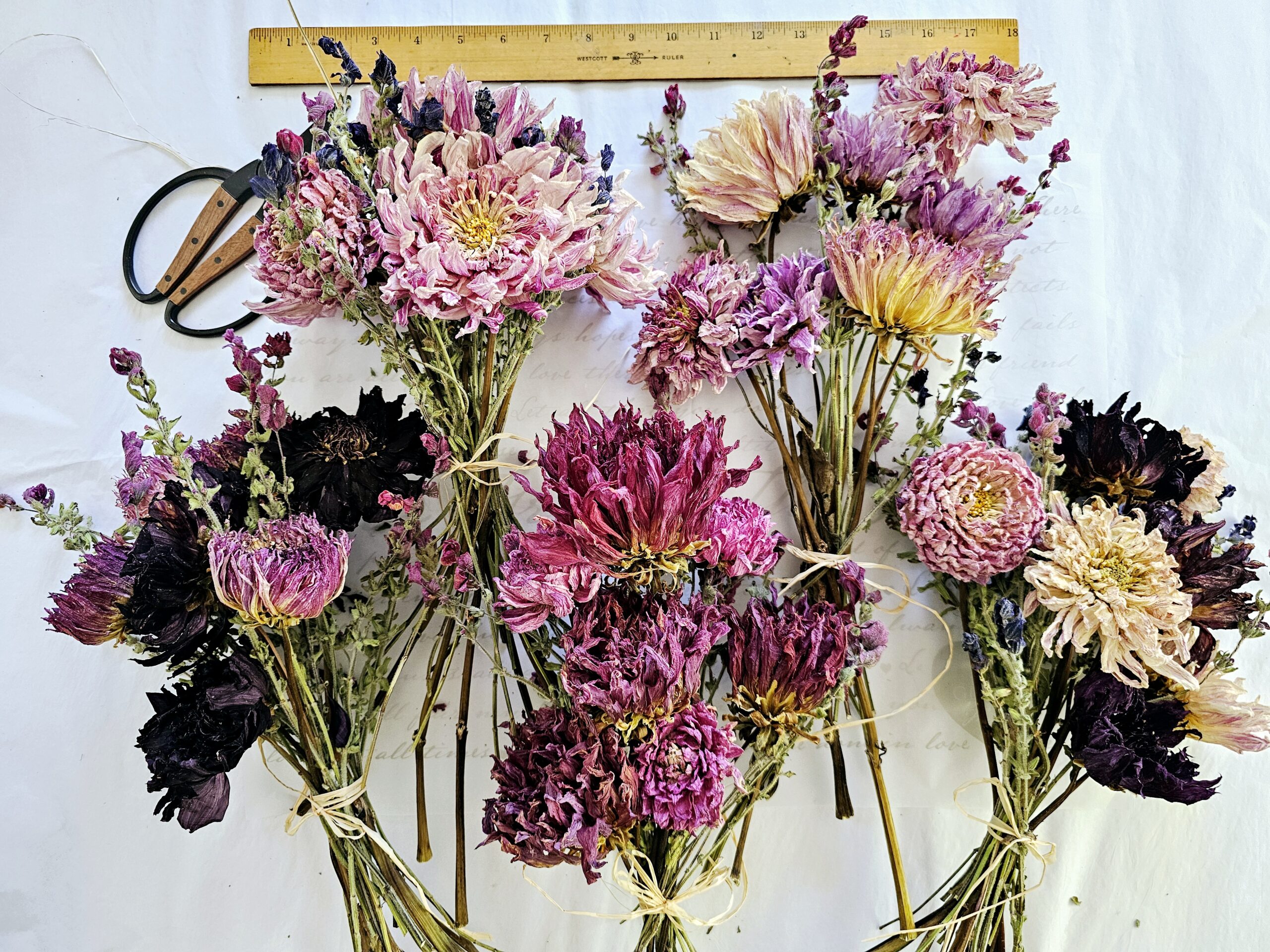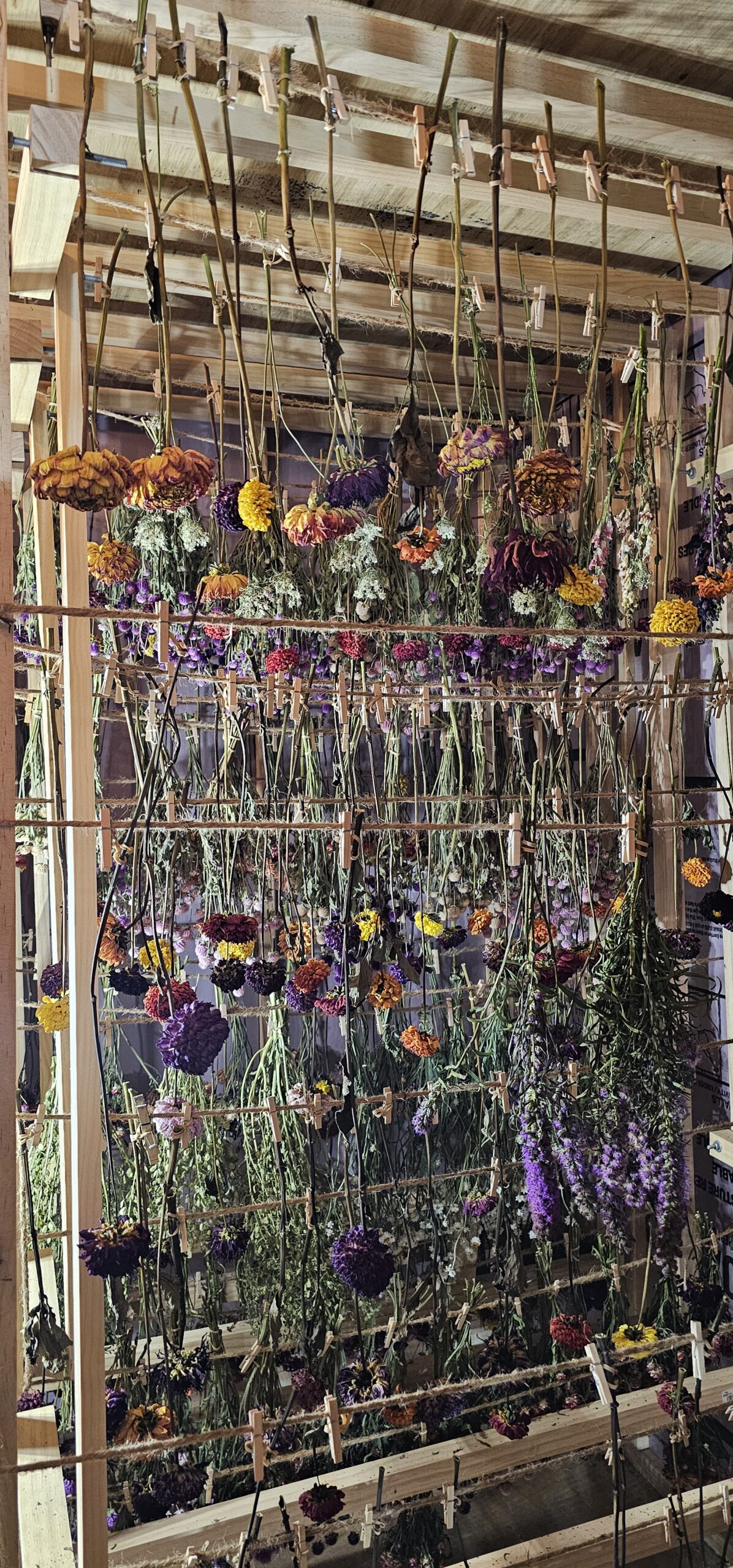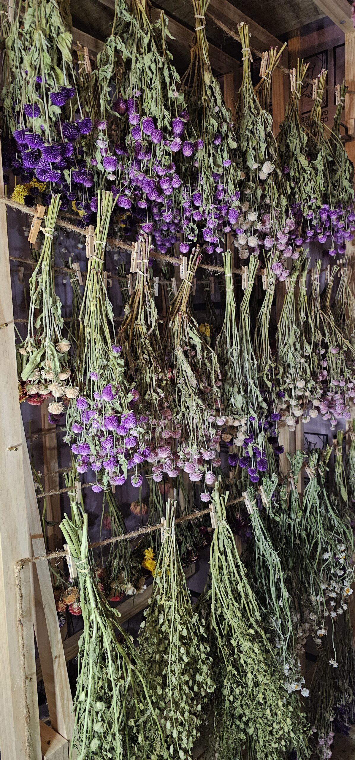 Once harvested, the flowers move to our purpose-built drying space, affectionately called “The DryMaster,” now in its fifth generation of refinements. This dark, temperature- and humidity-controlled barn environment, with carefully calibrated airflow, allows natural preservation without compromise. Individual stems or small, hand-curated bundles are hung on custom sliding racks (ingeniously fashioned from garage-door tracks and rollers) to promote even circulation and prevent any crushing or mold. Delicate varieties like dahlias are gently rotated – sometimes upright, sometimes inverted – to maintain petal shape and volumetric beauty. We inspect visually each day, adjusting as needed. The process, lasting days to weeks depending on the bloom, safeguards against UV fade and fungal risks while coaxing out rich, enduring hues and textures that feel alive.