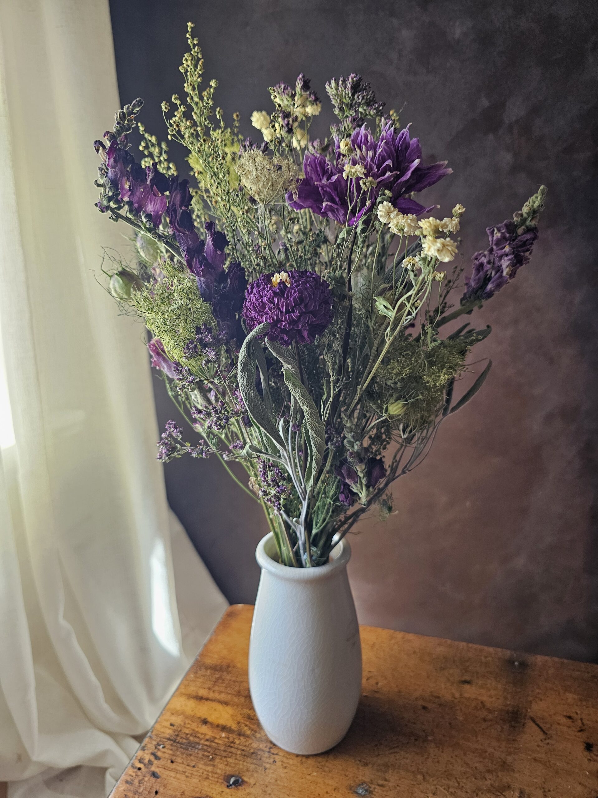 The journey begins long before harvest, rooted in the farm’s diverse glacial soils and our personal collection of heirlooms. We thoughtfully select varieties – including many rescued from the historic perennial gardens here, as well as favorites transplanted from our previous garden – for their natural predisposition to preserve form, color, and structure when dried. New candidates are trialed in small plots across different microclimates on the property, observed over multiple seasons for growth habits and post-harvest performance. Only those that prove reliable and true to their beauty advance to larger production. This patient, place-based approach creates a distinctive palette of textures and tones you won’t find in mass-produced offerings